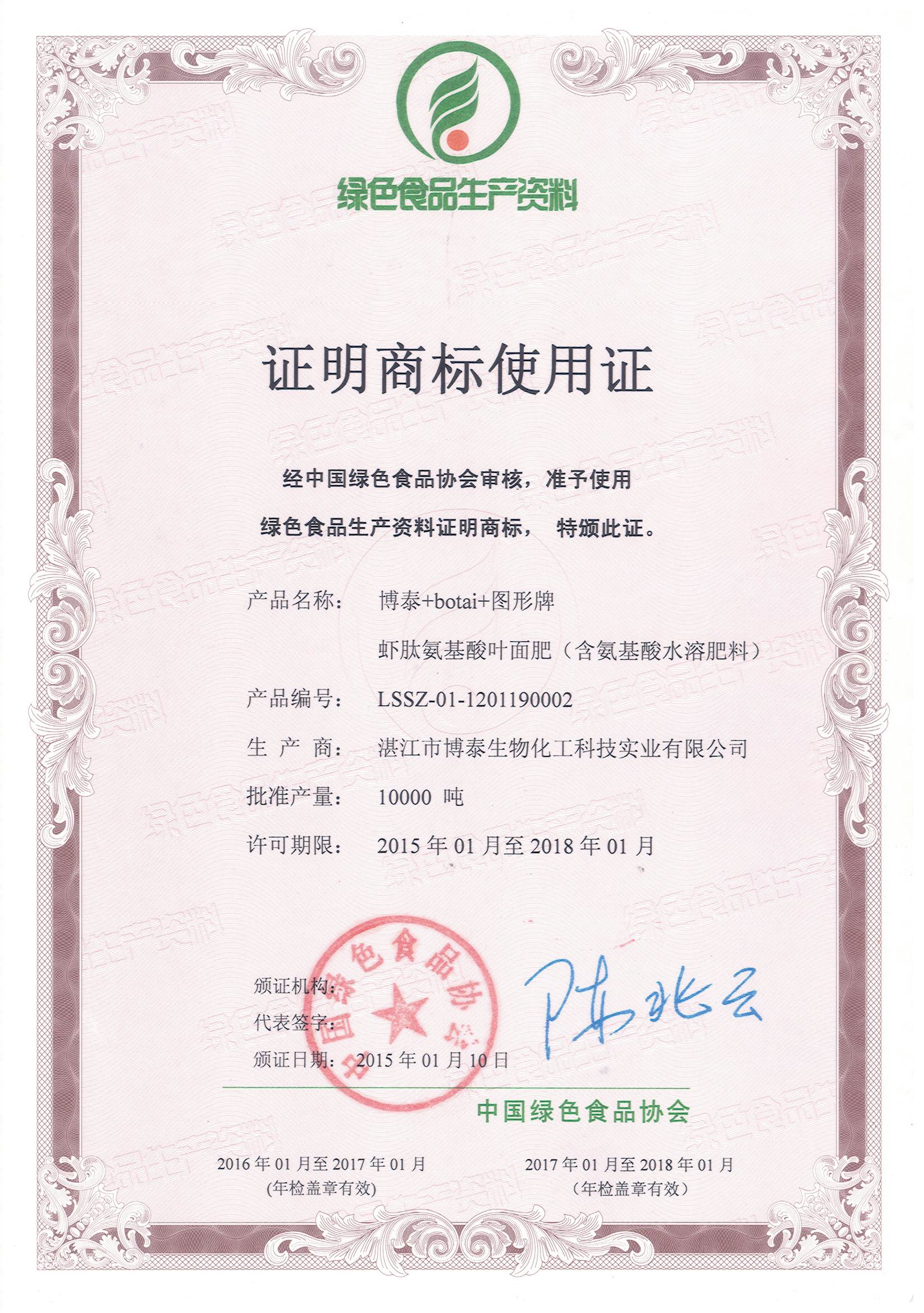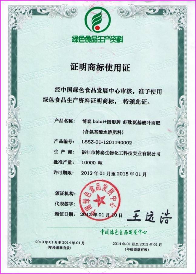 湛江博泰生物化工科技實(shí)業(yè)有限公司成功申報(bào)并在2012年1月10日和2015年1月10日分別獲得了由中國(guó)綠色食品發(fā)展中心和中國(guó)綠色協(xié)會(huì)頒發(fā)的“綠色食品生產(chǎn)資料證明商標(biāo)使用證”
