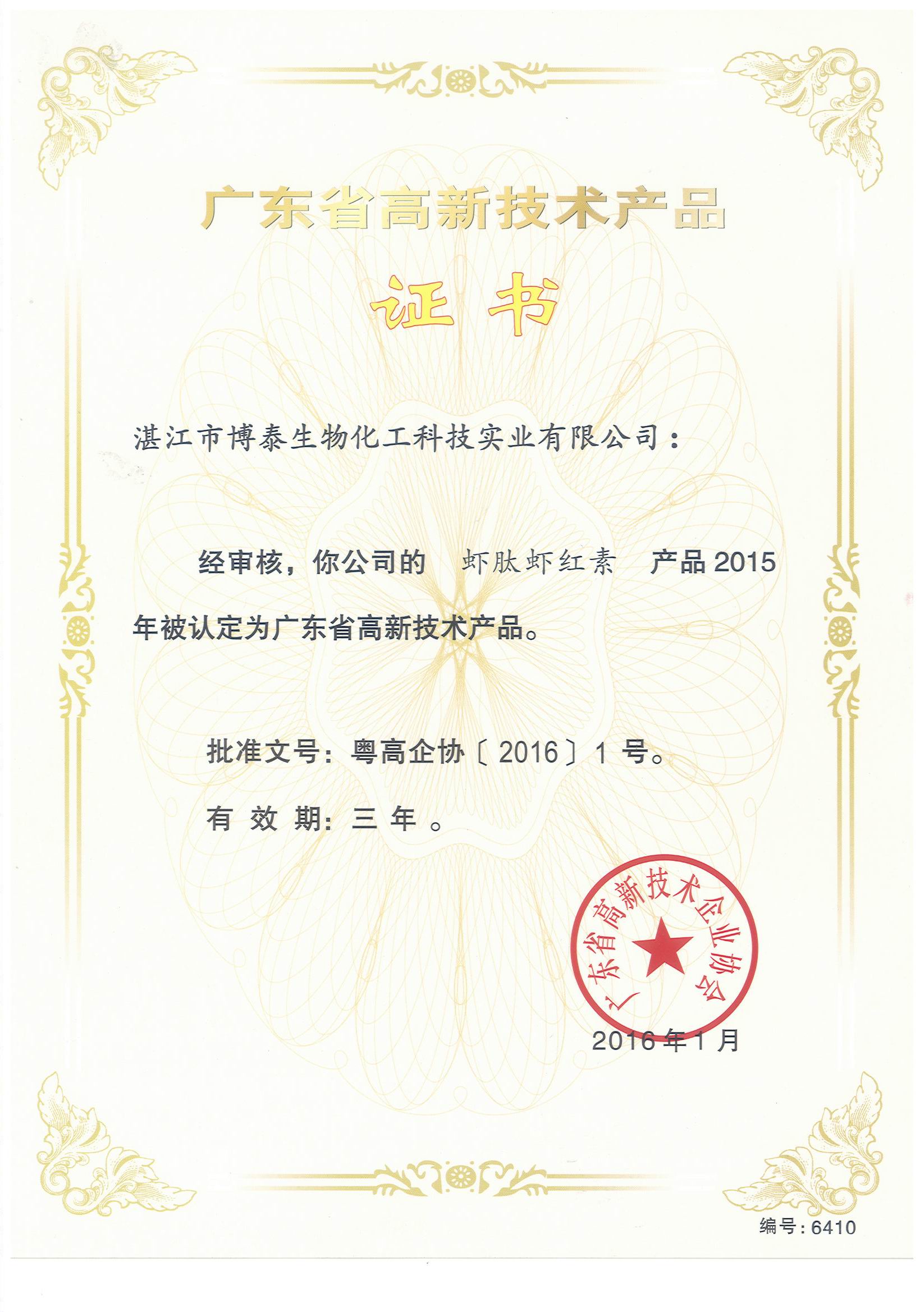 圖為 “蝦肽蝦紅素”高新技術(shù)產(chǎn)品證書(shū)