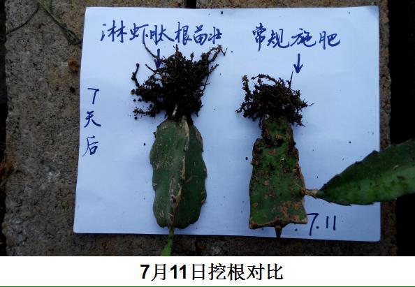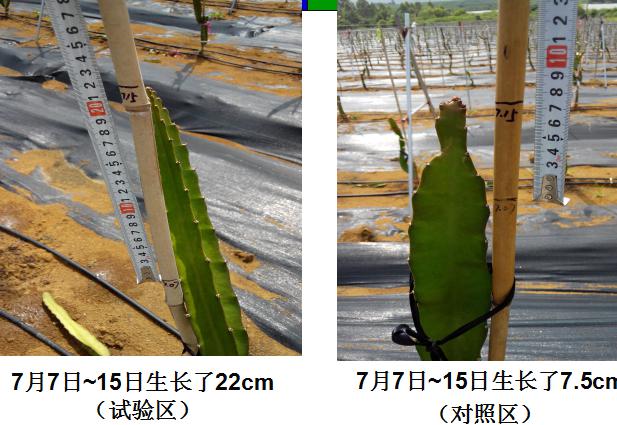 2、施用蝦肽酸性土壤調(diào)理液+根苗壯后,試驗區(qū)的火龍果的根部比對照區(qū)生長得更長、更粗壯,莖條比對照區(qū)生長更快(一個星期平均多長5cm左右)。原來停止生長的火龍果也開始生長伸長。
